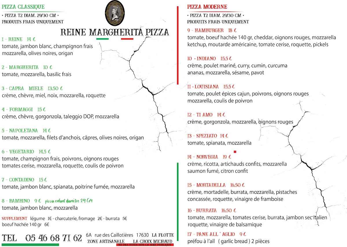 Reine Margherita Pizza delights with authentic, handcrafted pizzas in the heart of La Flotte, France. Their menu balances timeless classics and bold modern creations, showcasing superior ingredients and artisan techniques. The Pizza Classique line, led by the signature Margherita—with fresh tomato, creamy mozzarella, and fragrant basil—exemplifies simplicity elevated to perfection. The Reine, with its blend of tomato, tender jambon blanc, fresh mushrooms, black olives, and oregano, offers rich, well-rounded flavors. For adventurous palates, the Pizza Moderne offers unique options like the spicy Louisiana with Cajun-seasoned chicken and vibrant bell peppers, or the savory Indiano featuring marinated chicken with curry and pineapple. Customers consistently praise the perfectly baked dough, flavorful sauces, and generous toppings that rival traditional Neapolitan standards. The attentive, professional staff and swift service enhance the experience, making every order inviting and satisfying. Reine Margherita Pizza captures both heritage and innovation, promising a memorable takeaway pizza journey.